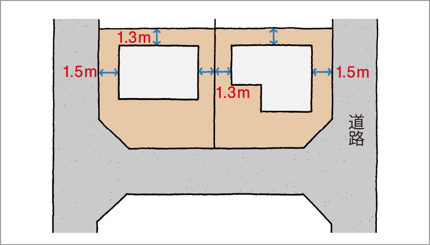 隣地境界から1.3m、道路から1.5m以内の範囲に建物を建築できないため採光や風通しが確保された良好な環境が維持されます。